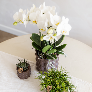 Verkrijgbaar in drie natuurlijke kleuren en drie formaten – 6 cm, 9 cm en 12 cm – is deze pot perfect als plantenpot of decoratief accent op een plank, vensterbank of tafel. Combineer de pot met je favoriete orchideeën of met een van onze kleine groene plantjes voor een frisse en gebalanceerde look.