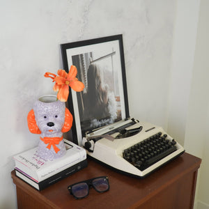 OP ZN HONDJES - Op zoek naar een vrolijke blikvanger voor je interieur? Deze bloemenvaas in de vorm van een hond steelt gegarandeerd de show! De speelse combinatie van lila en oranje geeft deze vaas een unieke, moderne uitstraling die perfect past in elk eigentijds of kleurrijk interieur. Gemaakt van stevig dolomiet en met een royaal formaat van 15,5x12,5x21cm is deze vaas ideaal voor een uitbundig boeket of een paar opvallende bloemen.