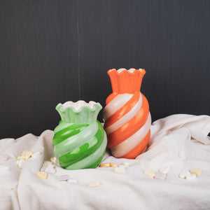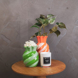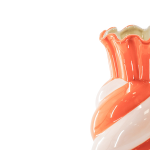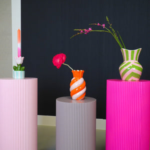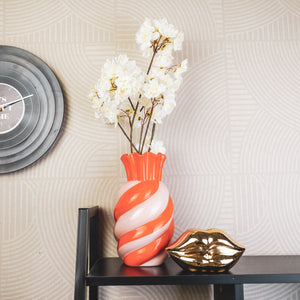 VASE IT! Vazen heb je nooit genoeg. Dit is echt een snoepje van een vaas in vrolijke kleuren. Deze swirl vaas met oranje en roze strepen fleurt een ruimte meteen op en daar zul je blij van worden.